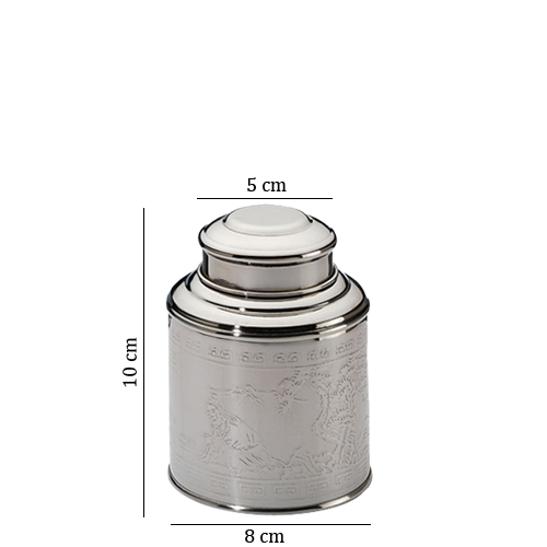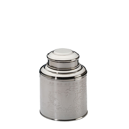 Très jolie boîte à thé en acier inoxydable avec des motifs asiatiques en relief, pour une conservation optimale de vos thés, tisanes, plantes…
