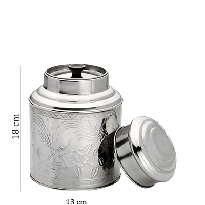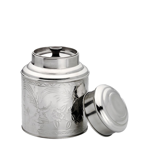 Très jolie boîte à thé en acier inoxydable avec des motifs asiatiques en relief.