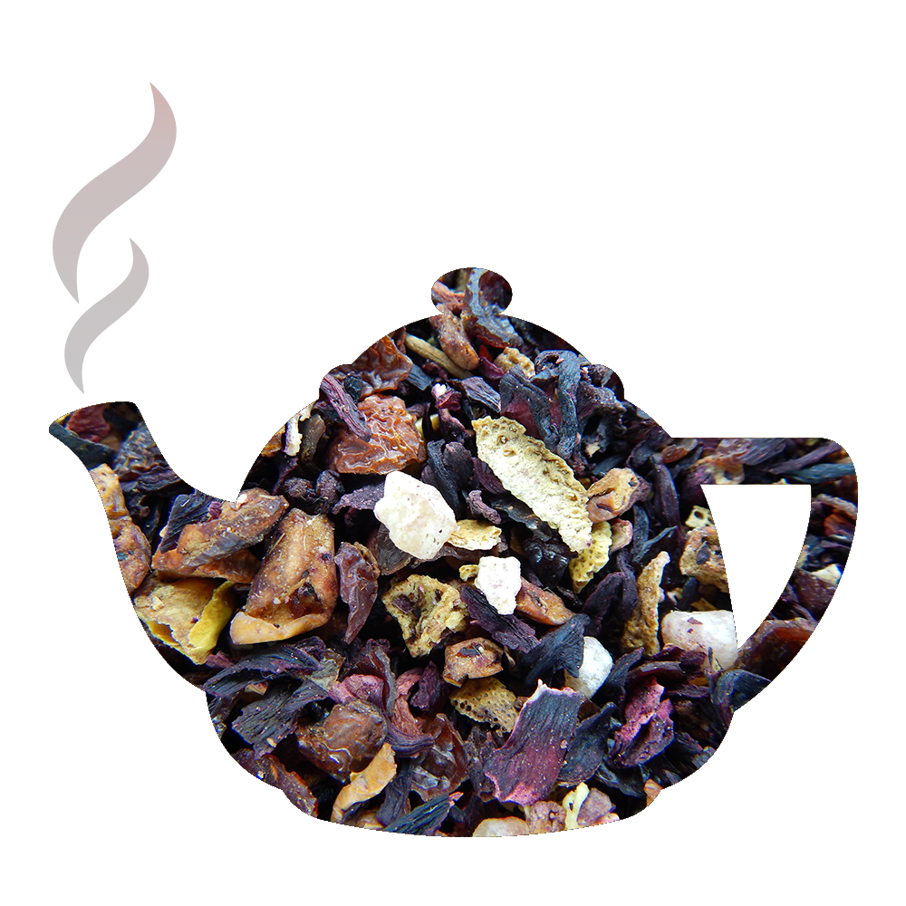 Hibiscus, écorces de cynorhodon, pomme, morceaux d’ananas sucrés et de citron vert, zestes d’orange, framboise, croustillant de yaourt, morceaux de kiwi. Arômes naturels de melon, citron vert et grenadine.