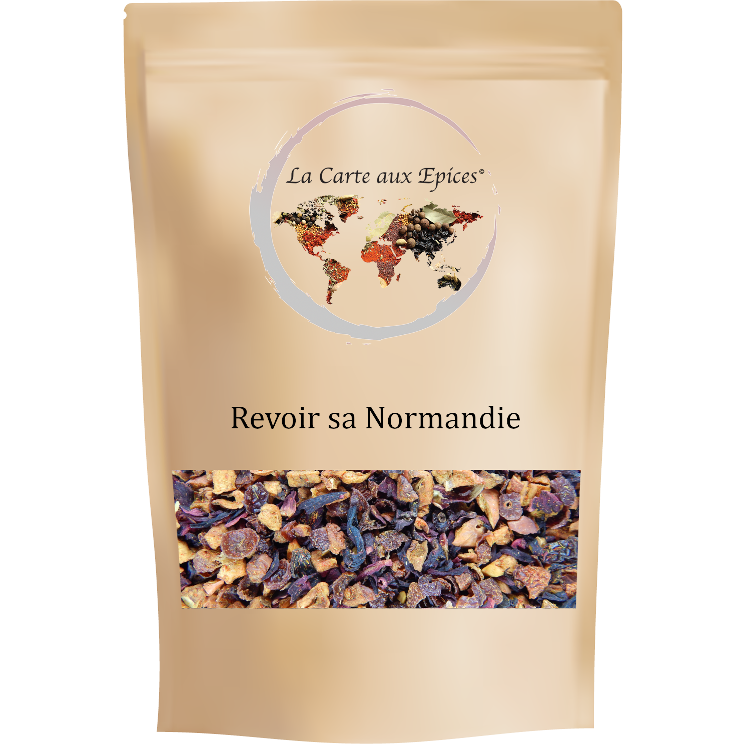 Pomme, écorces de cynorhodon, hibiscus, amandes, carthame. Arômes naturels cannelle et crème.