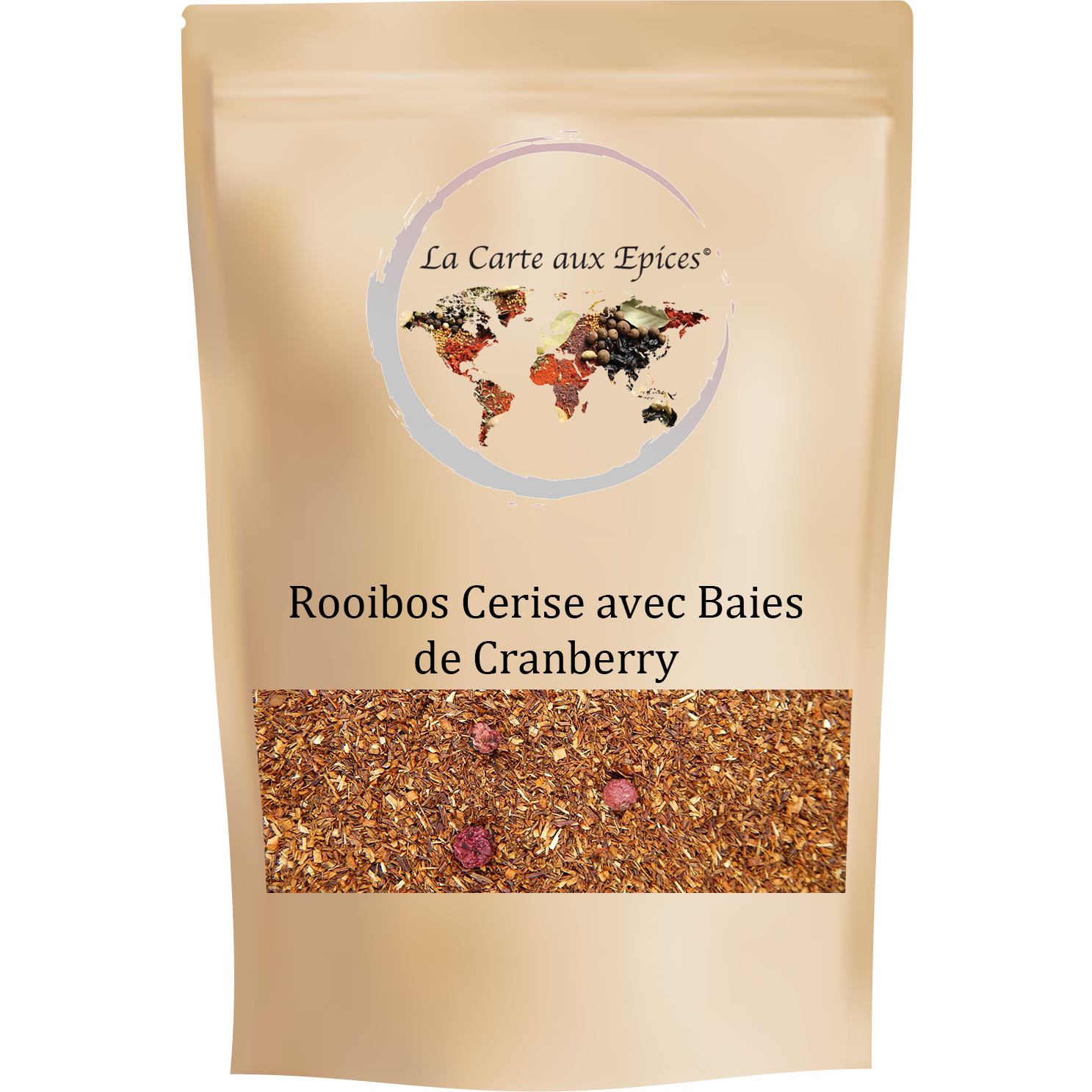 Rooibos d’Afrique du sud parsemé de baies de Cranberry, fleurs de souci, arôme naturel de griotte.