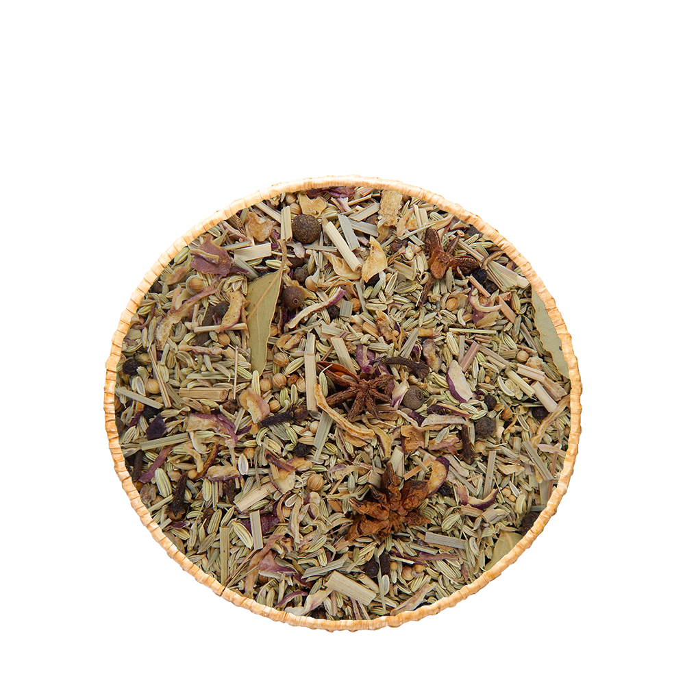 La carte aux épices vous propose son mélange composé de fenouil, cumin, moutarde, nigelle, poivre noir, échalote, citronnelle, badiane, girofle, coriandre, poivre de la Jamaïque, laurier.