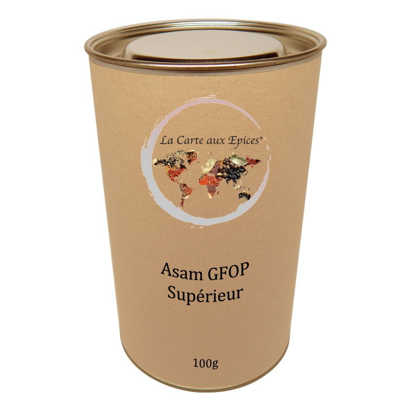 Thé noir du matin qui s’accommode de lait et de sucre. Feuilles entières parsemées de pointes dorées en provenance des meilleures plantations des Upper Assam. Saveur ronde et équilibrée, liqueur de belle couleur orangé.